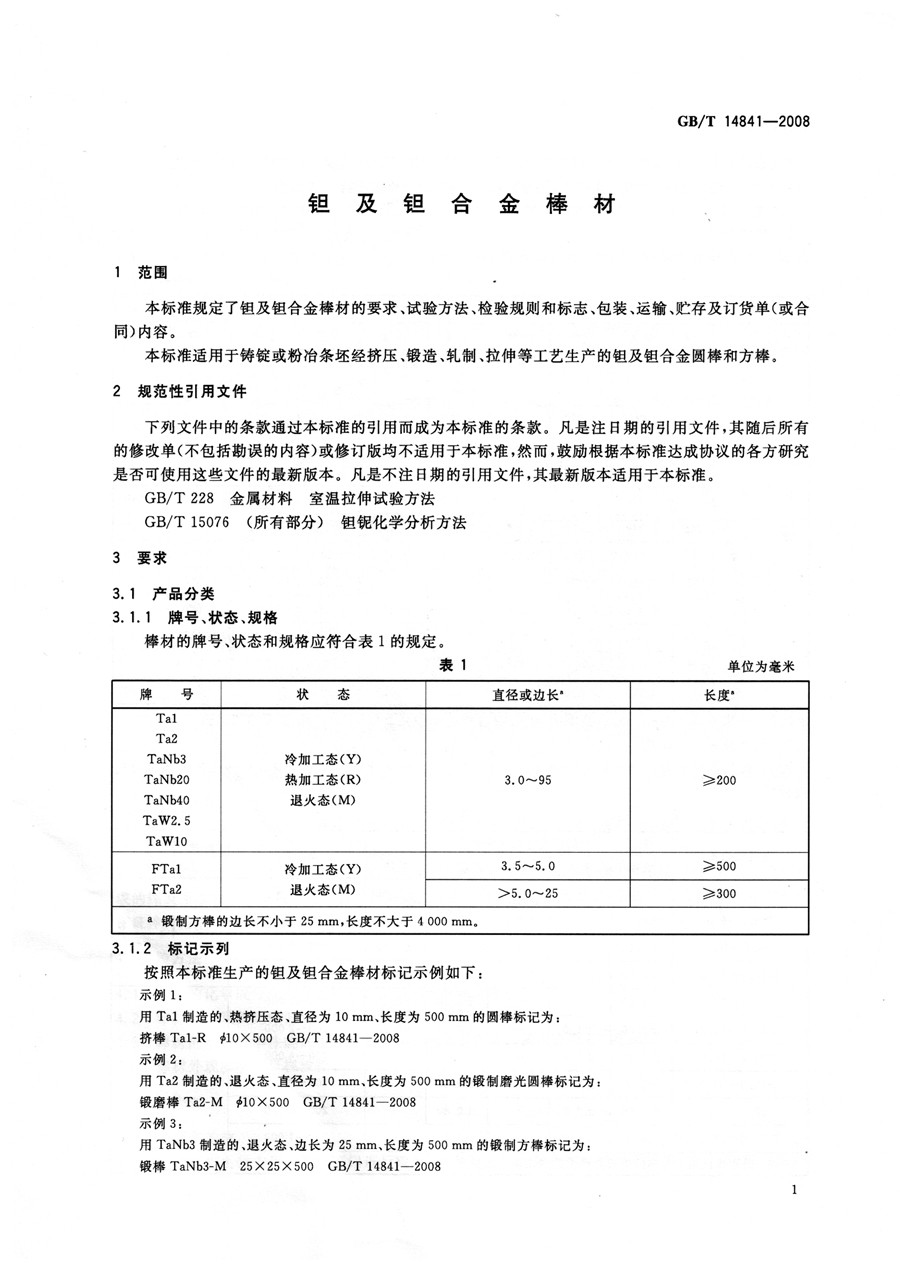 鉭棒材 GB/T 14841-2008國家標準